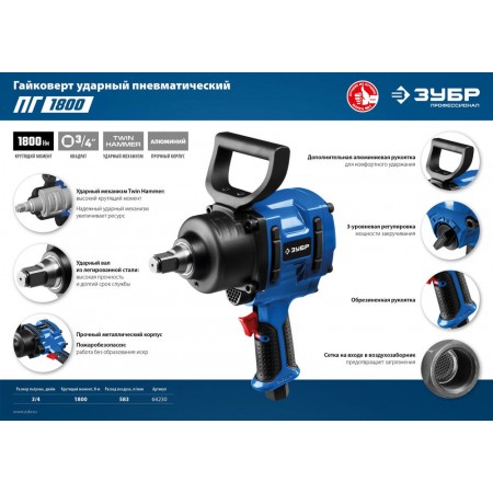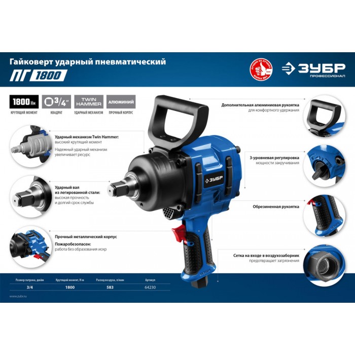 Профессиональный пневматический гайковерт. Благодаря высокому крутящему моменту эффективно работает с прикипевшим крепежом грузового автотранспорта. Компактный корпус позволяет работать в труднодоступным местах.