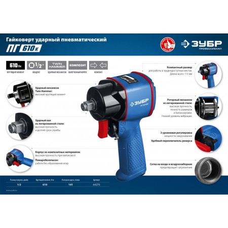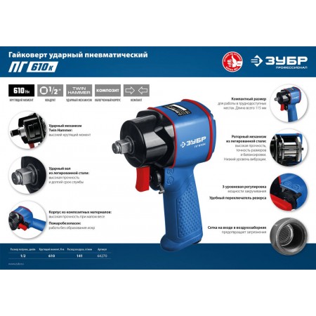 Профессиональный пневматический гайковерт. Компактные размеры (так называемый, ″мини″) позволяют работать в труднодоступных местах. Благодаря конструкции внутреннего механизма, инструмент развивает высокий крутящий момент без уменьшения рабочего ресурса