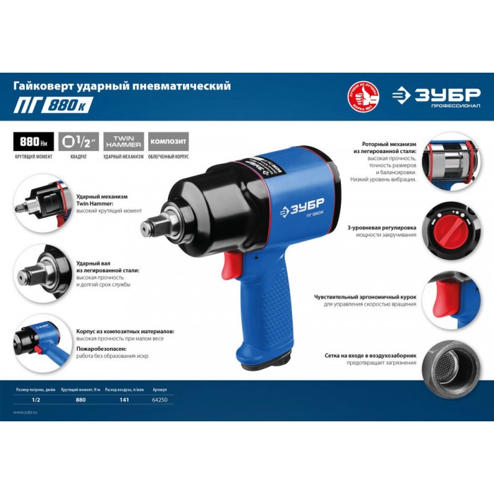 Профессиональный пневматический гайковерт. Крутящий момент 880 Нм обеспечивает высокую производительность. Обладает повышенной износостойкостью внутренних элементов. Предназначен для использования на СТО, шиномонтажах и других ремонтных мастерских.