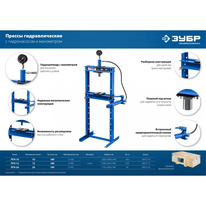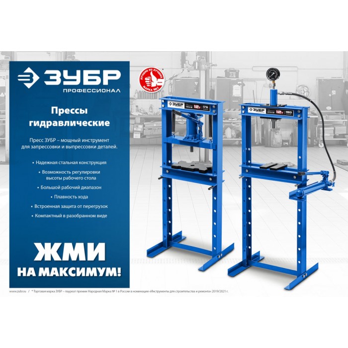 Пресс гидравлический 10 т с гидронасосом и манометром ЗУБР ПГН-10 Профессионал 43072-10