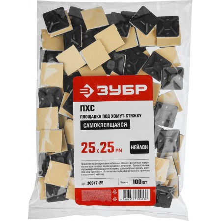 Площадка самоклеющаяся под хомут-стяжку 25 х 25 мм, нейлон, 100 шт, черная ЗУБР ПХС 30917-25