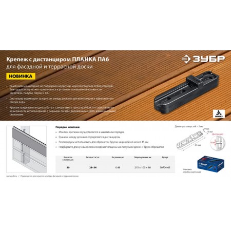 Для скрытого монтажа фасадной и террасной доски. Изготовлен из композитного материала, не подверженного коррозии, благодаря чему может применяться в условиях повышенной влажности (пристани, палубы, пирсы и т.п.)