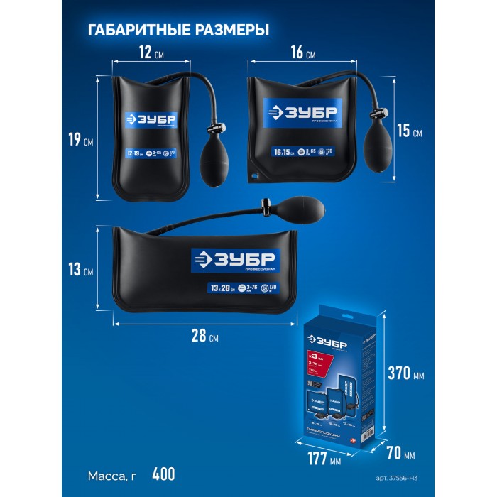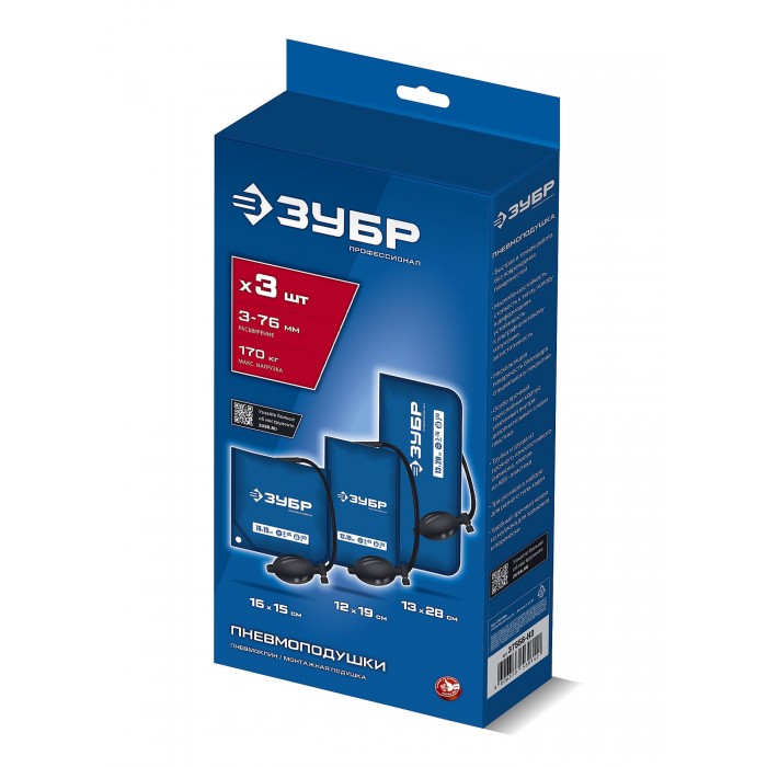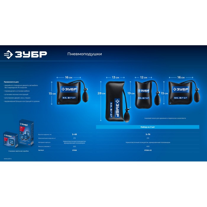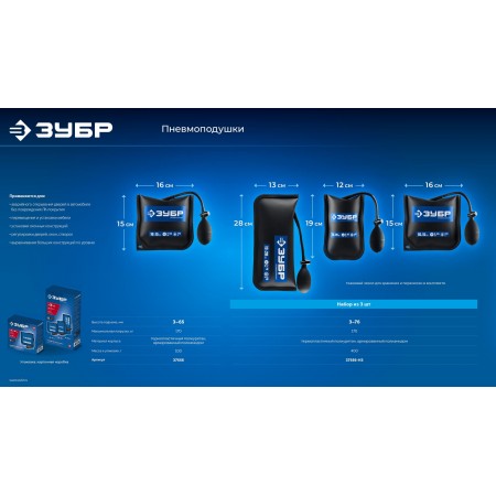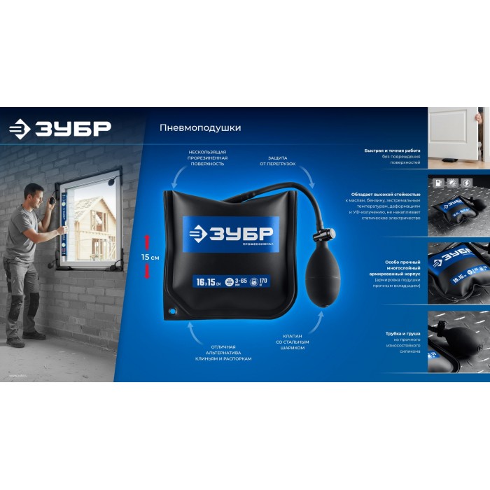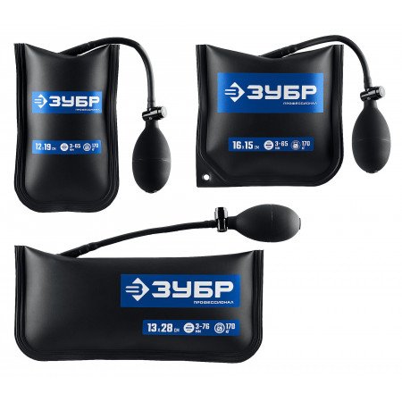 Профессиональный инструмент из прочных и высококачественных материалов, набор подходит для многочисленных вариантов использования: Установка окон, шкафов, дверей, бытовой техники, систем вентиляции и кондиционирования, столешниц, мебели и многого другого! Безопасный подъем тяжелых предметов (например холодильников, шкафов) для доступа под ними. Экономьте время благодаря возможностям набора пневмоклиньев ЗУБР. Поставляется в удобном прочном чехле из ткани Оксфорд 420d.