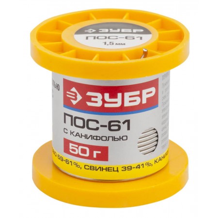 Припой ПОС 61 Зубр 55450-050-15C применяется для лужения и пайки элементов электро- и радиоаппаратуры, печатных схем, точных приборов с герметичными швами, где недопустим перегрев, пайка жести, обмоток электрических машин, монтажных элементов, моточных и кабельных изделий, радиаторов и листового цинка, оцинкованных деталей холодильных агрегатов, теплообменников, электроламп, кабельных оболочек, тонколистовой упаковки. Припой с 61% содержанием олова и 39% содержанием свинца оптимально подходит в случаях, когда элементы для спайки нельзя перегревать. Продукция предназначена для профессионального использования. Припой имеет высший уровень качества и прошёл спектральную и химическую проверку. Соответствует ГОСТ 21931-76.
