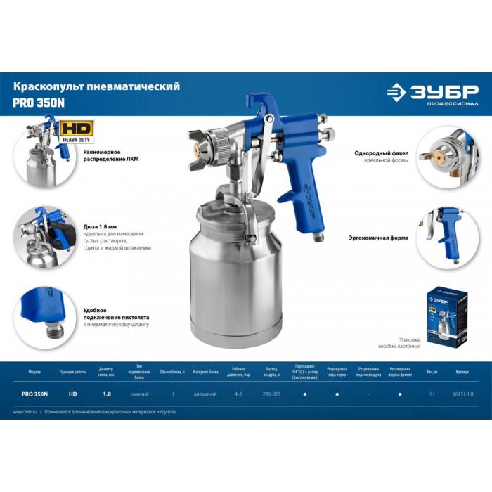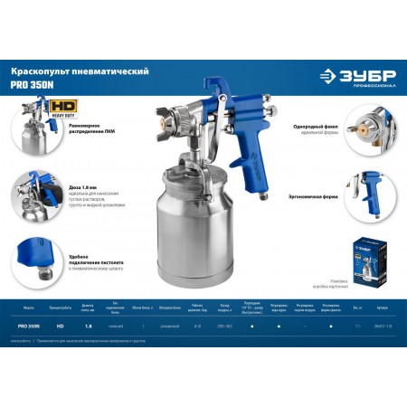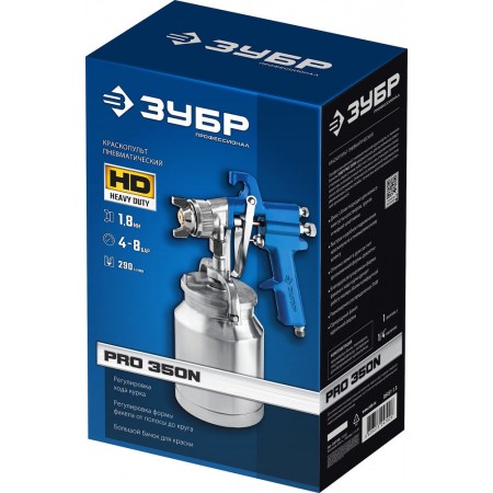 Краскопульт пневматический PRO 350N, 1.8 мм, с нижним бачком ЗУБР Профессионал 06451-1.8