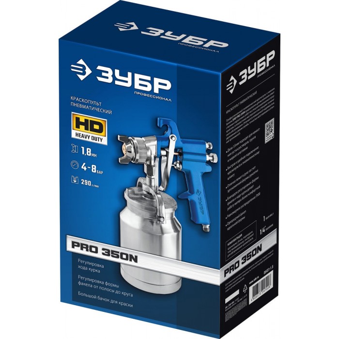 Профессиональный пневматический краскопульт ЗУБР ″ПРО Н350″ - надежный инструмент для окрасочных работ в мастерских на специализированных предприятиях, отличающийся точностью и долгим сроком службы