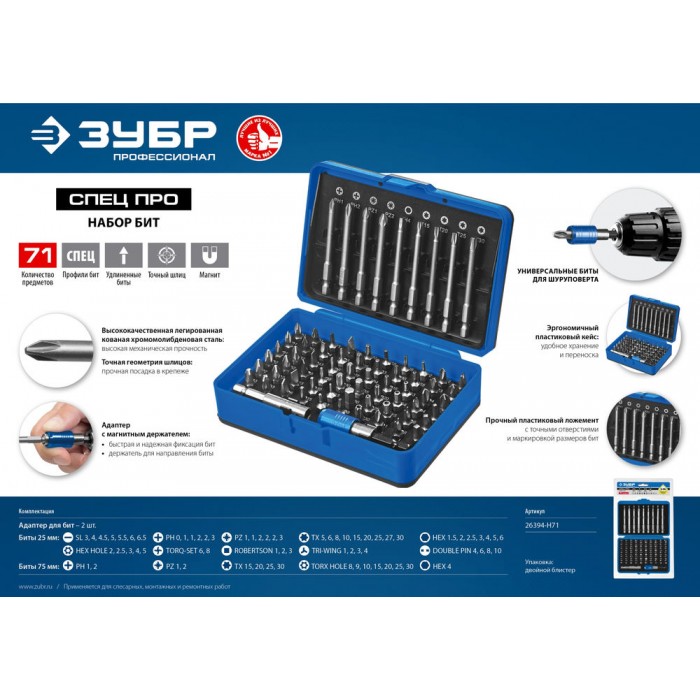 Профессиональные биты ЗУБР для ручного и механизированного инструмента изготовлены из высококачественной стали и имеют точную геометрию шлицов, что обеспечивает длительный срок службы.