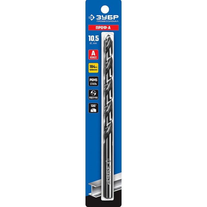 Сверло по металлу удлиненное 10.5 x 184 мм сталь Р6М5 класс А ЗУБР ПРОФ-А Профессионал 29624-10.5