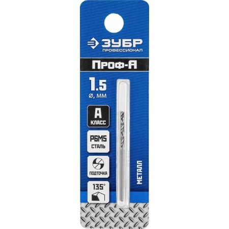 Сверло по металлу 1.5 x 40 мм сталь Р6М5 класс А ЗУБР ПРОФ-А Профессионал 29625-1.5