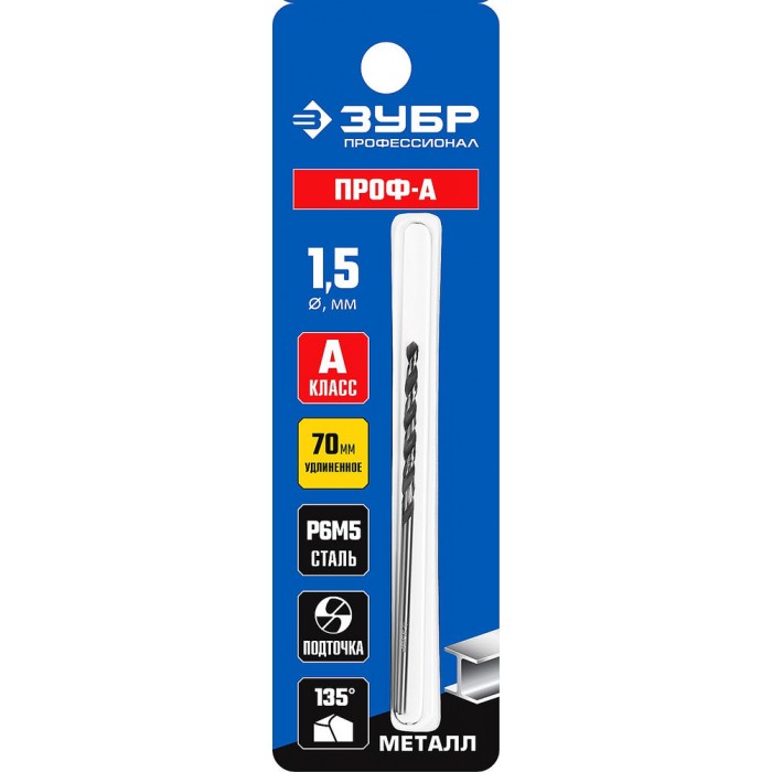 Сверло по металлу удлиненное 1.5 x 70 мм сталь Р6М5 класс А ЗУБР ПРОФ-А Профессионал 29624-1.5