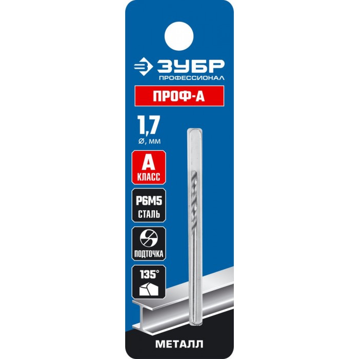 Сверло по металлу 1.7 x 43 мм сталь Р6М5 класс А ЗУБР ПРОФ-А Профессионал 29625-1.7