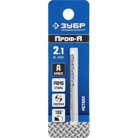 Сверло по металлу 2.1 x 49 мм сталь Р6М5 класс А ЗУБР ПРОФ-А Профессионал 29625-2.1
