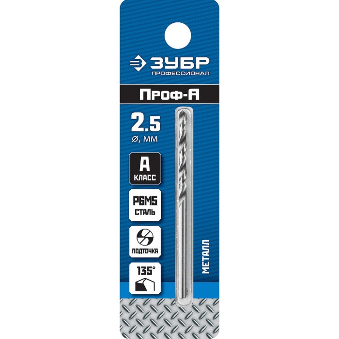 Сверло по металлу 2.5 x 57 мм сталь Р6М5 класс А ЗУБР ПРОФ-А Профессионал 29625-2.5