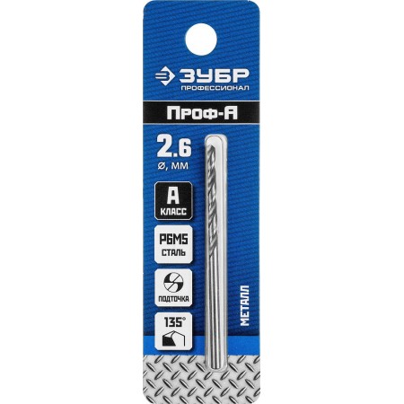 Сверло по металлу 2.6 x 57 мм сталь Р6М5 класс А ЗУБР ПРОФ-А Профессионал 29625-2.6