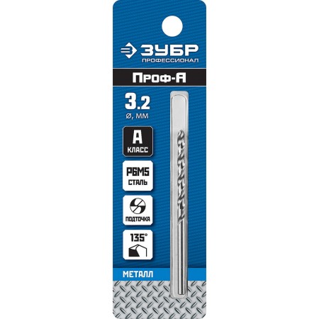 Сверло по металлу 3.2 x 65 мм сталь Р6М5 класс А ЗУБР ПРОФ-А Профессионал 29625-3.2