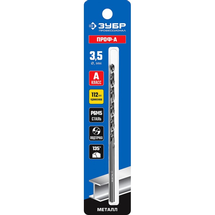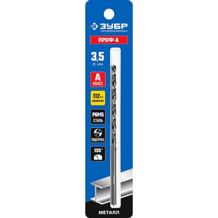 Сверло по металлу удлиненное 3.5 x 112 мм сталь Р6М5 класс А ЗУБР ПРОФ-А Профессионал 29624-3.5