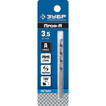 Сверло по металлу 3.5 x 70 мм сталь Р6М5 класс А ЗУБР ПРОФ-А Профессионал 29625-3.5