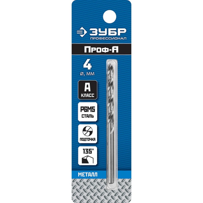 Сверло по металлу 4.0 x 75 мм сталь Р6М5 класс А ЗУБР ПРОФ-А Профессионал 29625-4