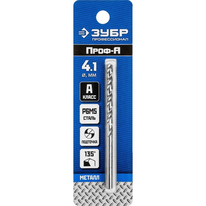 Сверло по металлу 4.1 x 75 мм сталь Р6М5 класс А ЗУБР ПРОФ-А Профессионал 29625-4.1