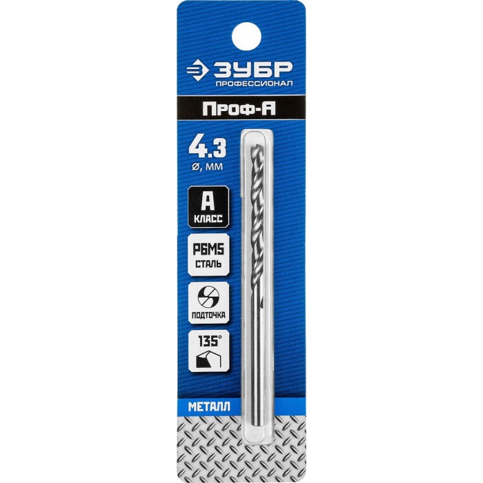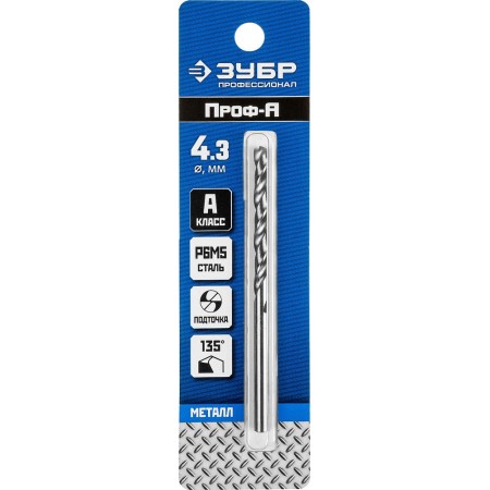 Сверло по металлу 4.3 x 80 мм сталь Р6М5 класс А ЗУБР ПРОФ-А Профессионал 29625-4.3