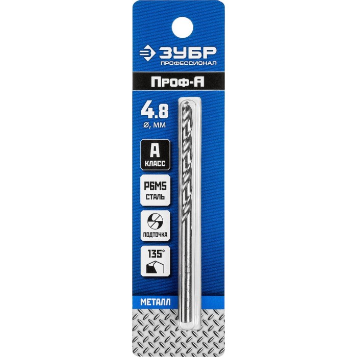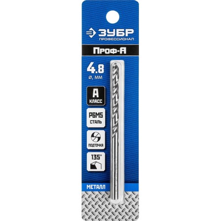 Сверло по металлу 4.8 x 86 мм сталь Р6М5 класс А ЗУБР ПРОФ-А Профессионал 29625-4.8