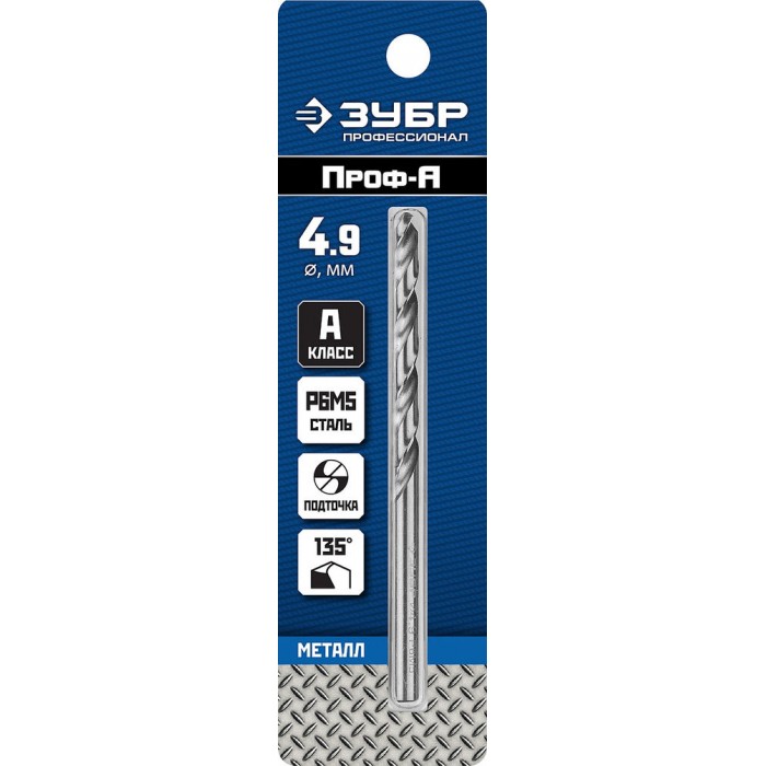 Сверло по металлу 4.9 x 86 мм сталь Р6М5 класс А ЗУБР ПРОФ-А Профессионал 29625-4.9