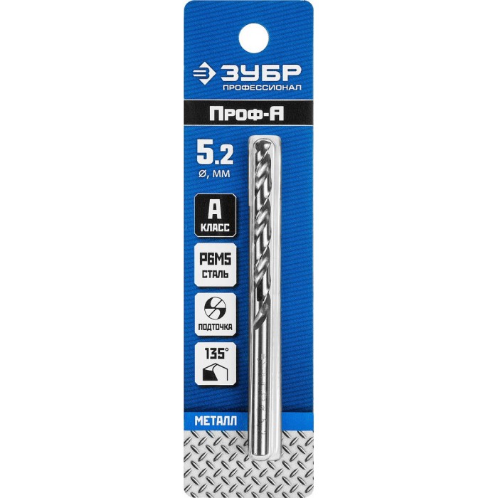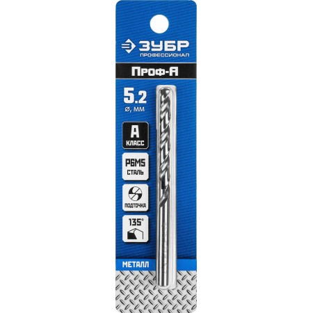 Сверло по металлу 5.2 x 86 мм сталь Р6М5 класс А ЗУБР ПРОФ-А Профессионал 29625-5.2