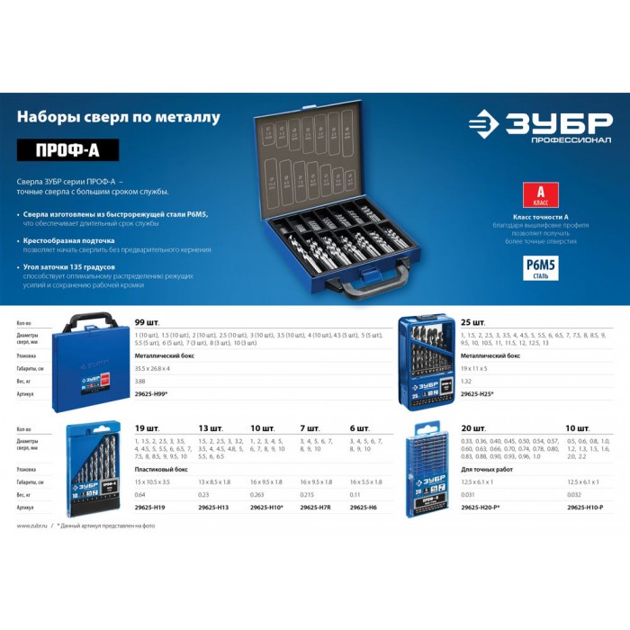 Набор сверл по металлу 2-8 мм 6 шт сталь Р6М5 класс А ЗУБР ПРОФ-А Профессионал 29625-H6