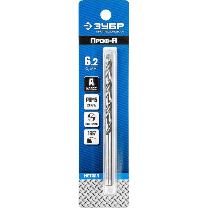 Сверло по металлу 6.2 x 101 мм сталь Р6М5 класс А ЗУБР ПРОФ-А Профессионал 29625-6.2
