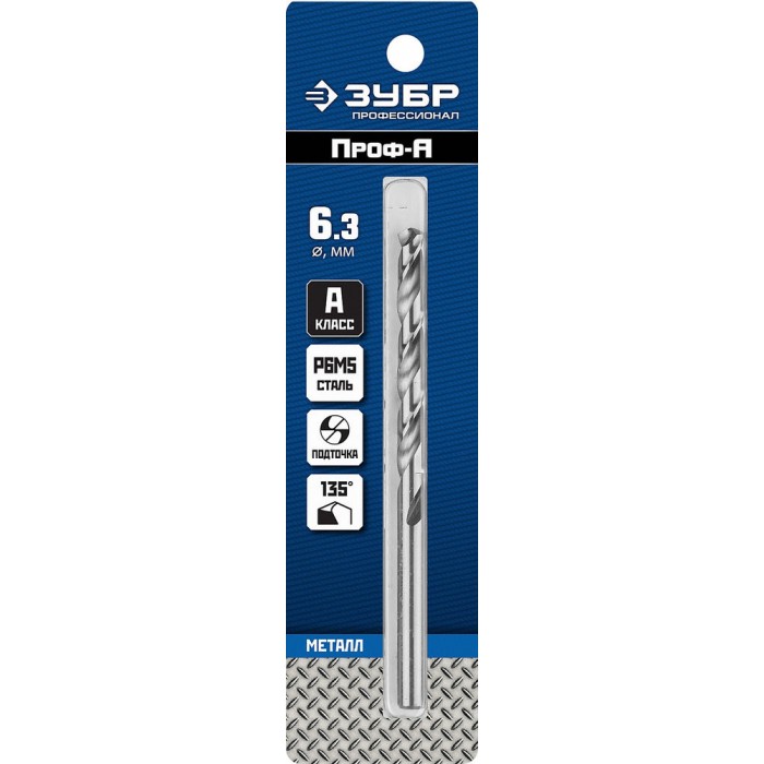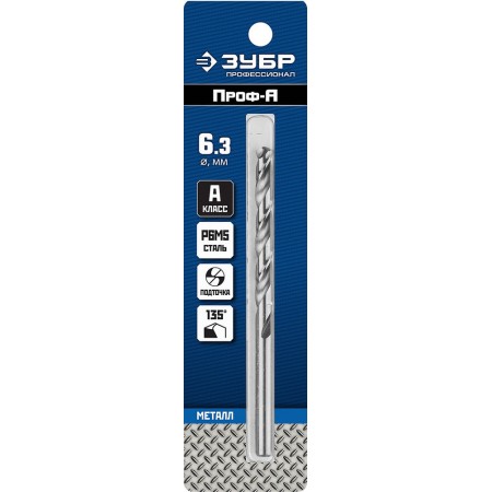 Сверло по металлу 6.3 x 101 мм сталь Р6М5 класс А ЗУБР ПРОФ-А Профессионал 29625-6.3