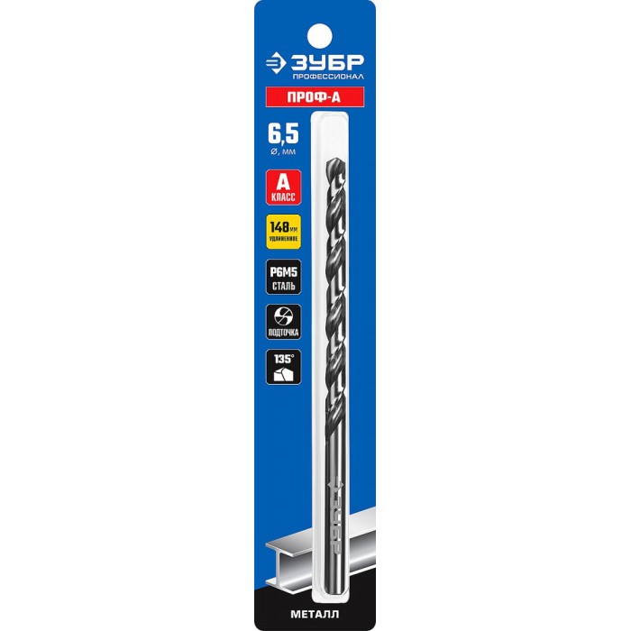 Сверло по металлу удлиненное 6.5 x 148 мм сталь Р6М5 класс А ЗУБР ПРОФ-А Профессионал 29624-6.5