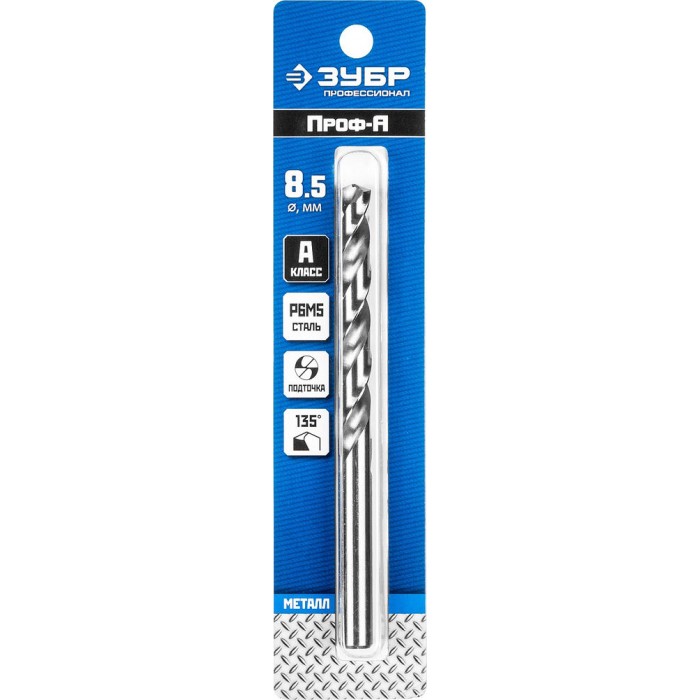 Сверло по металлу 8.5 x 117 мм сталь Р6М5 класс А ЗУБР ПРОФ-А Профессионал 29625-8.5