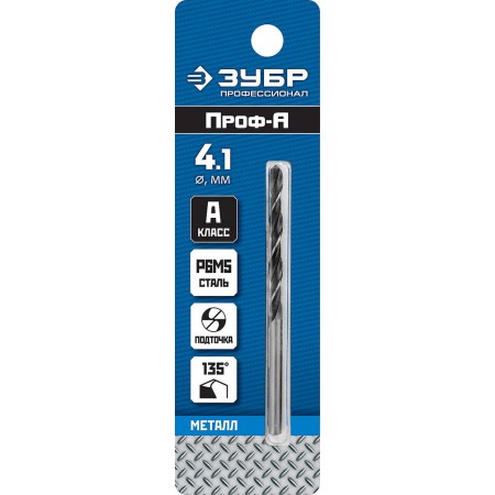 Сверло по металлу 4.1 x 75 мм сталь Р6М5 класс В ЗУБР ПРОФ-В Профессионал 29621-4.1