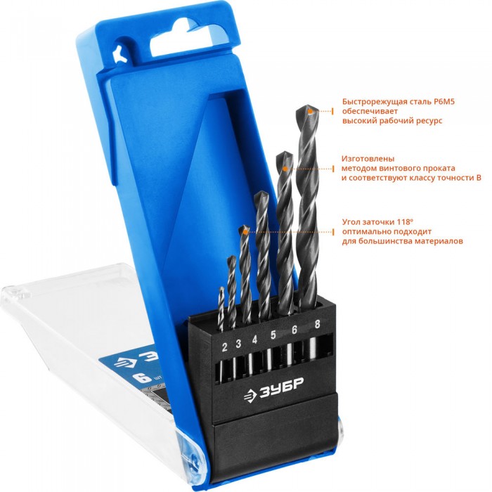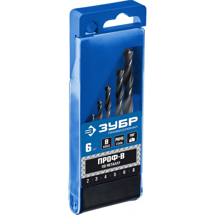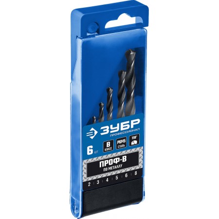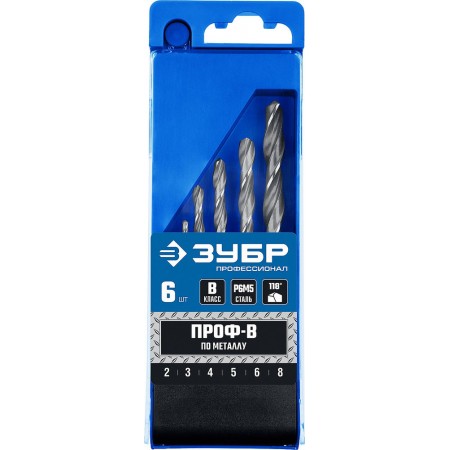 Набор сверл по металлу 2-8 мм 6 шт сталь Р6М5 класс В ЗУБР ПРОФ-В Профессионал 29621-H6