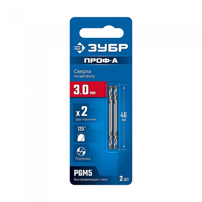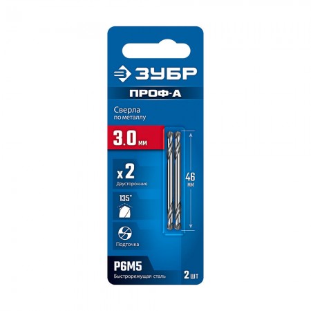 Сверло двухстороннее по металлу 3.0 х 46 мм, сталь Р6М5, класс А ЗУБР Профессионал 29627-3.0