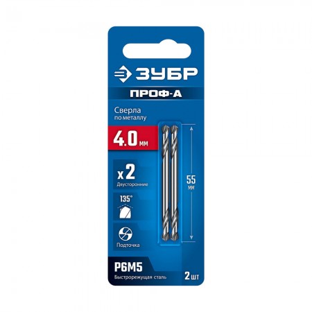 Сверло двухстороннее по металлу 4.0 х 55 мм, сталь Р6М5, класс А ЗУБР Профессионал 29627-4.0