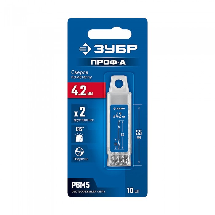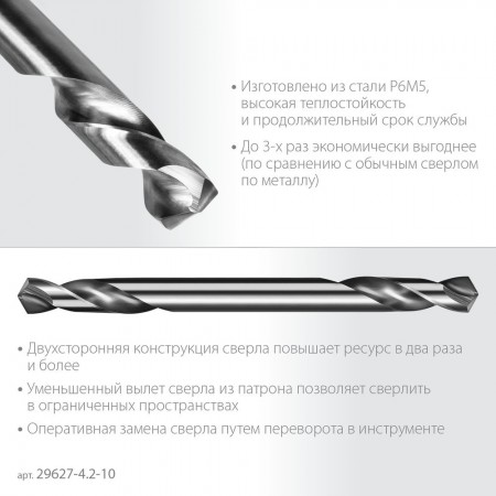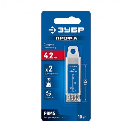 Сверло двухстороннее по металлу 4.2 х 55 мм, сталь Р6М5, класс А, 10 шт ЗУБР Профессионал 29627-4.2-10