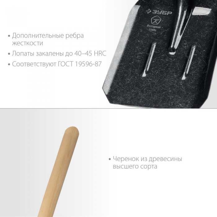 Совковая лопата тип ЛСП 350х230х1450мм полотно рессор.сталь 1.6мм закалено c ребрами жестк. черенок высш.сорт Профессионал ЗУБР ПРОФИ-5 39457