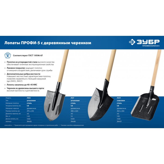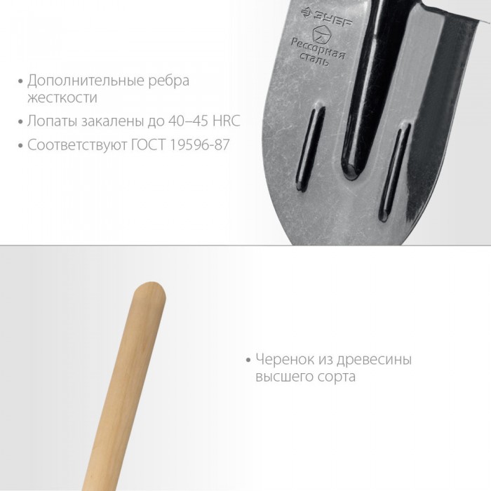 Штыковая лопата тип ЛКО 375х210х1450мм полотно рессор.сталь 1.6мм закалено c ребрами жесткости черенок высш.сорт Профессионал ЗУБР ПРОФИ-5 39455