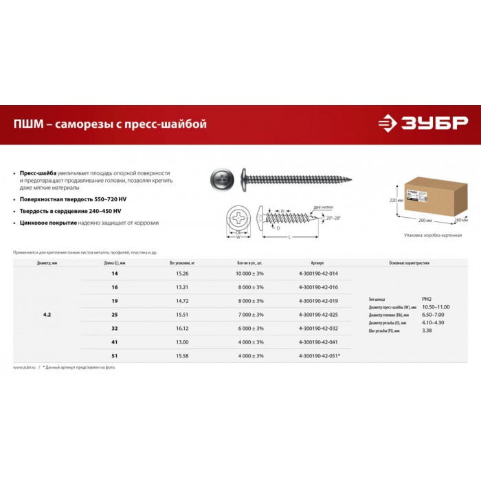 Саморез с пресс-шайбой 14 х 4.2 мм, цинк, 15.26 кг ЗУБР ПШМ 4-300190-42-014_z01