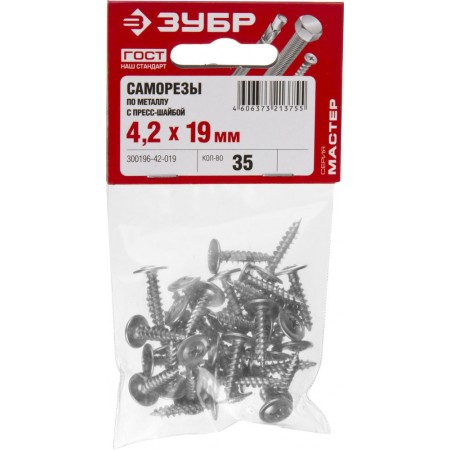 Саморезы с пресс-шайбой для листового металла изготовлены из стального прутка с высоким содержанием углерода. Контроль за геометрией самореза начинается с калибровки прутка и заканчивается тщательной проверкой размеров готового изделия. Нормативная твердость стали достигается термической обработкой. Поверхностная твердость 550-720HV, твердость в сердцевине 240-450HV. Саморезы легко вкручиваются обычным шуруповертом или отверткой с крестообразным шлицем PH2 (DIN). Предварительное сверление в скрепляемых материалах не требуется. Геометрические размеры: диаметр пресс-шайбы (W) - 10.5-11.0мм, диаметр головки (Dk) - 6.5-7.0мм, диаметр резьбы (D) - 4.1-4.3мм, шаг резьбы (Pi) - 3.38мм.