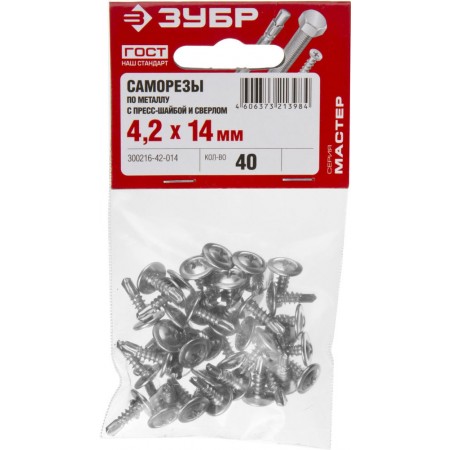 Саморезы с пресс-шайбой и сверлом для листового металла изготовлены из стального прутка с высоким содержанием углерода. Контроль за геометрией самореза начинается с калибровки прутка и заканчивается тщательной проверкой размеров готового изделия. Нормативная твердость стали достигается термической обработкой. Поверхностная твердость 560-720HV, твердость в сердцевине 240-425HV. Саморезы легко вкручиваются обычным шуруповертом или отверткой с крестообразным шлицем PH2 (DIN). Предварительное сверление в скрепляемых материалах не требуется. Геометрические размеры: диаметр пресс-шайбы (W) - 10.5-11.0мм, диаметр головки (Dk) - 6.5-7.0мм, диаметр резьбы (D) - 4.04-4.22мм, диаметр сверла (dp) - 3.1-3.2мм, длина сверла (ds) - 3.7-3.8мм, шаг резьбы (Pi) - 1.41мм.