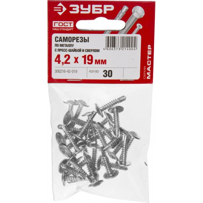 Саморез с пресс-шайбой и сверлом 19 х 4.2 мм, цинк, 30 шт ЗУБР ПШМ-С 300216-42-019