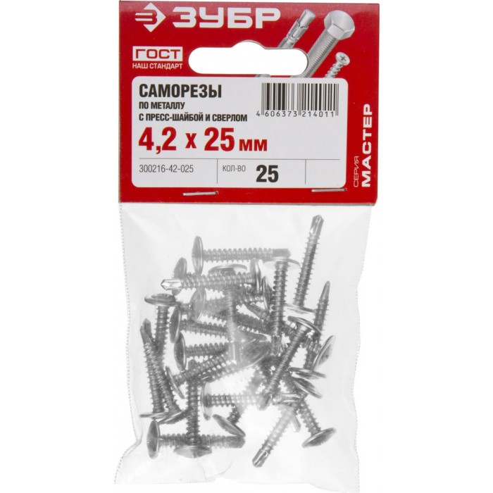 Саморез с пресс-шайбой и сверлом 25 х 4.2 мм, цинк, 25 шт ЗУБР ПШМ-С 300216-42-025