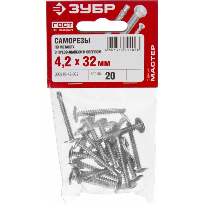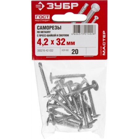 Саморезы с пресс-шайбой и сверлом для листового металла изготовлены из стального прутка с высоким содержанием углерода. Контроль за геометрией самореза начинается с калибровки прутка и заканчивается тщательной проверкой размеров готового изделия. Нормативная твердость стали достигается термической обработкой. Поверхностная твердость 560-720HV, твердость в сердцевине 240-425HV. Саморезы легко вкручиваются обычным шуруповертом или отверткой с крестообразным шлицем PH2 (DIN). Предварительное сверление в скрепляемых материалах не требуется. Геометрические размеры: диаметр пресс-шайбы (W) - 10.5-11.0мм, диаметр головки (Dk) - 6.5-7.0мм, диаметр резьбы (D) - 4.04-4.22мм, диаметр сверла (dp) - 3.1-3.2мм, длина сверла (ds) - 3.7-3.8мм, шаг резьбы (Pi) - 1.41мм.