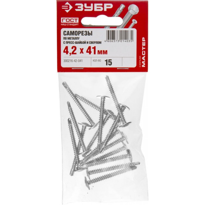 Саморез с пресс-шайбой и сверлом 41 х 4.2 мм, цинк, 15 шт ЗУБР ПШМ-С 300216-42-041