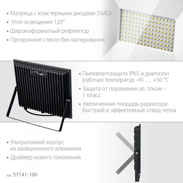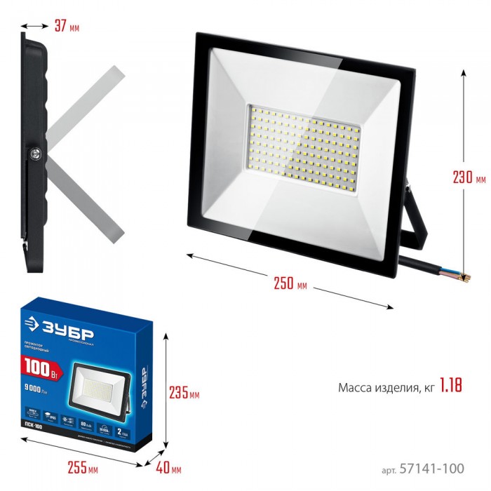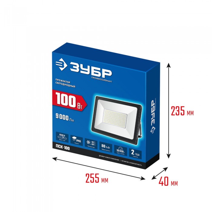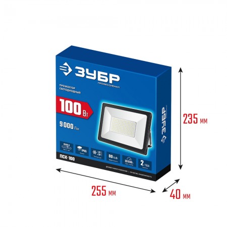 Прожектор светодиодный 100 Вт, 6500 К, IP65 ЗУБР ПСК-100 Профессионал 57141-100
