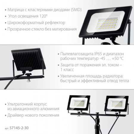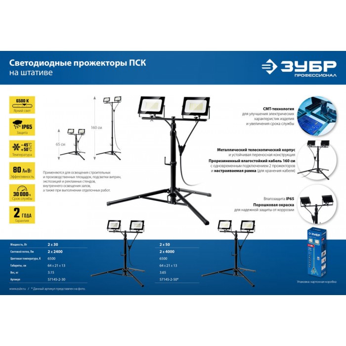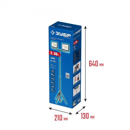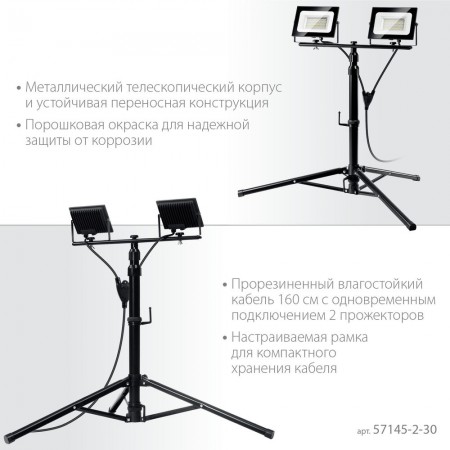 Прожекторы светодиодные на штативе 2 х 30 Вт, 6500 К, IP65, 1.6 м ЗУБР ПСК 30х2 Профессионал 57145-2-30