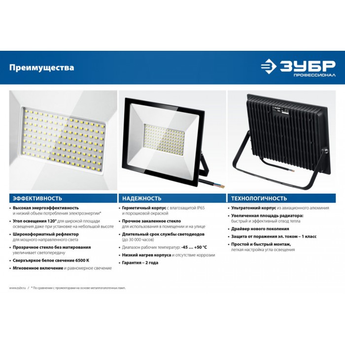 Прожекторы ЗУБР предназначены для подсветки зданий, сооружений, памятников, рекламных щитов, а также для освещения парковок, стадионов и других объектов. Благодаря ударопрочному корпусу, термостойкому стеклу и высокому классу электрозащиты эти изделия можно использовать на улице в любую погоду.