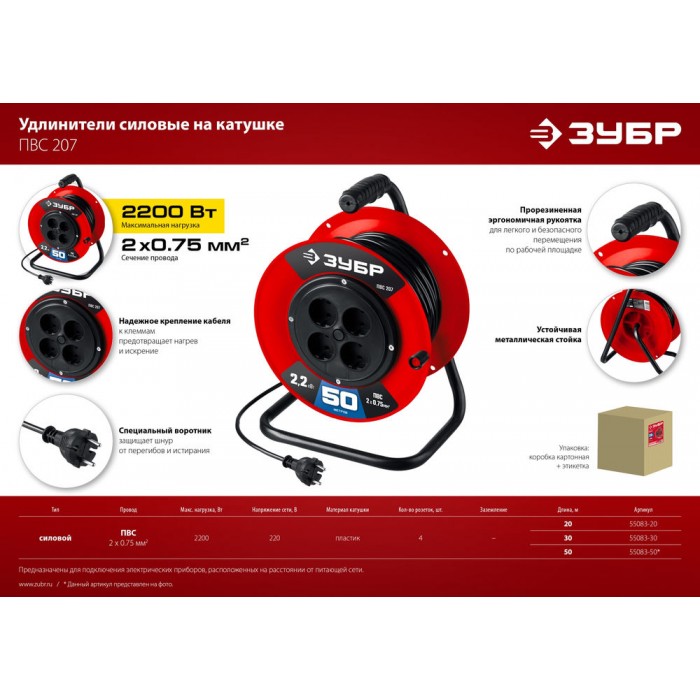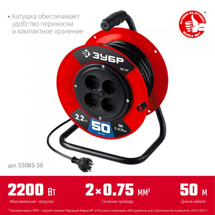 Удлинитель на катушке ПВС 2 x 0.75 мм2 50 м 2200 Вт ЗУБР ПВС-207 55083-50_z01